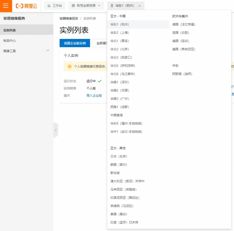 REGISTRY 是阿里云容器镜像服务地址,其中的 cn-shenzhen 是区域的地址,你只需要替换到离你最近的区域即可,可用的区域列表请参考地域和可用区列表中的地域ID。