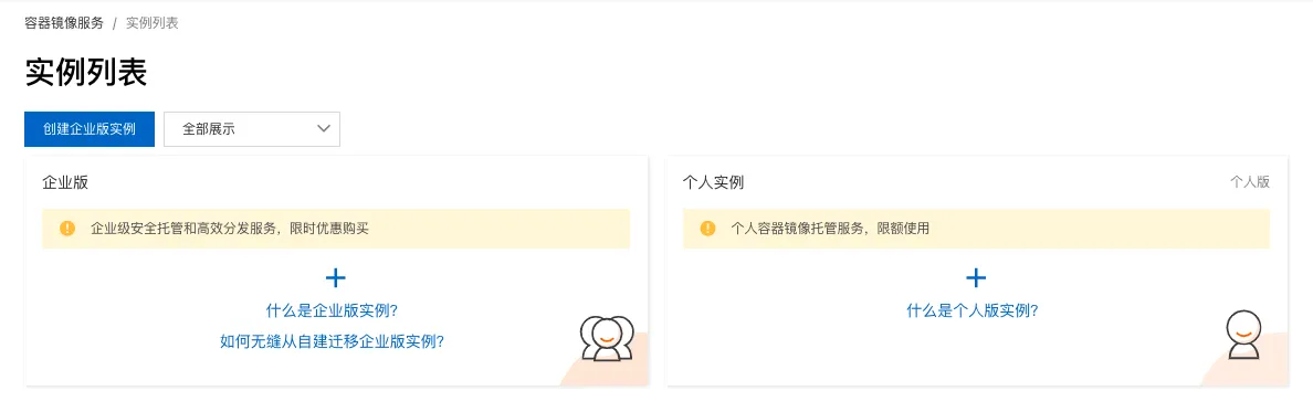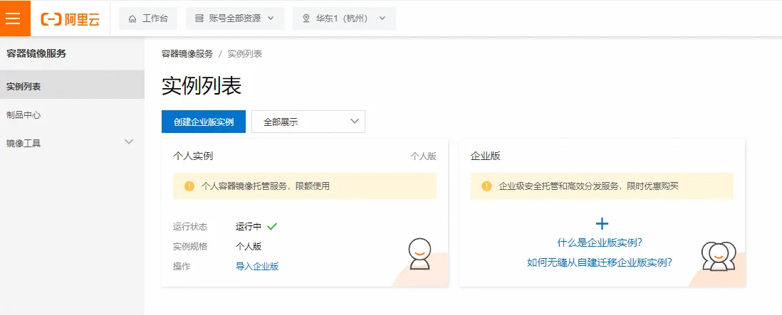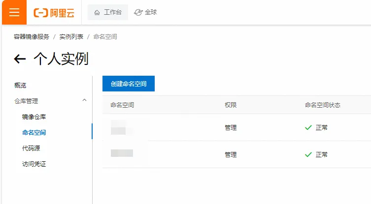 6.在个人版实例管理页面选择仓库管理 > 命名空间。