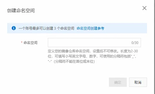 - NAMESPACE 是镜像的命名空间,管理该命名空间下的仓库集合,包括仓库权限和仓库属性,这里你随意设置一个自己记得住的字符串即可。