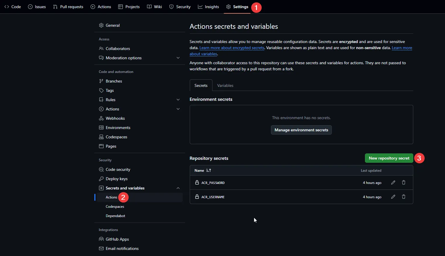 ACR_PASSWORD: ${{ secrets.ACR_PASSWORD }}在 GitHub 仓库的 Settings 中点击 Secrets and variables > Actions,然后在 Repository secrets 点击 New repository secret 来添加鉴权信息: